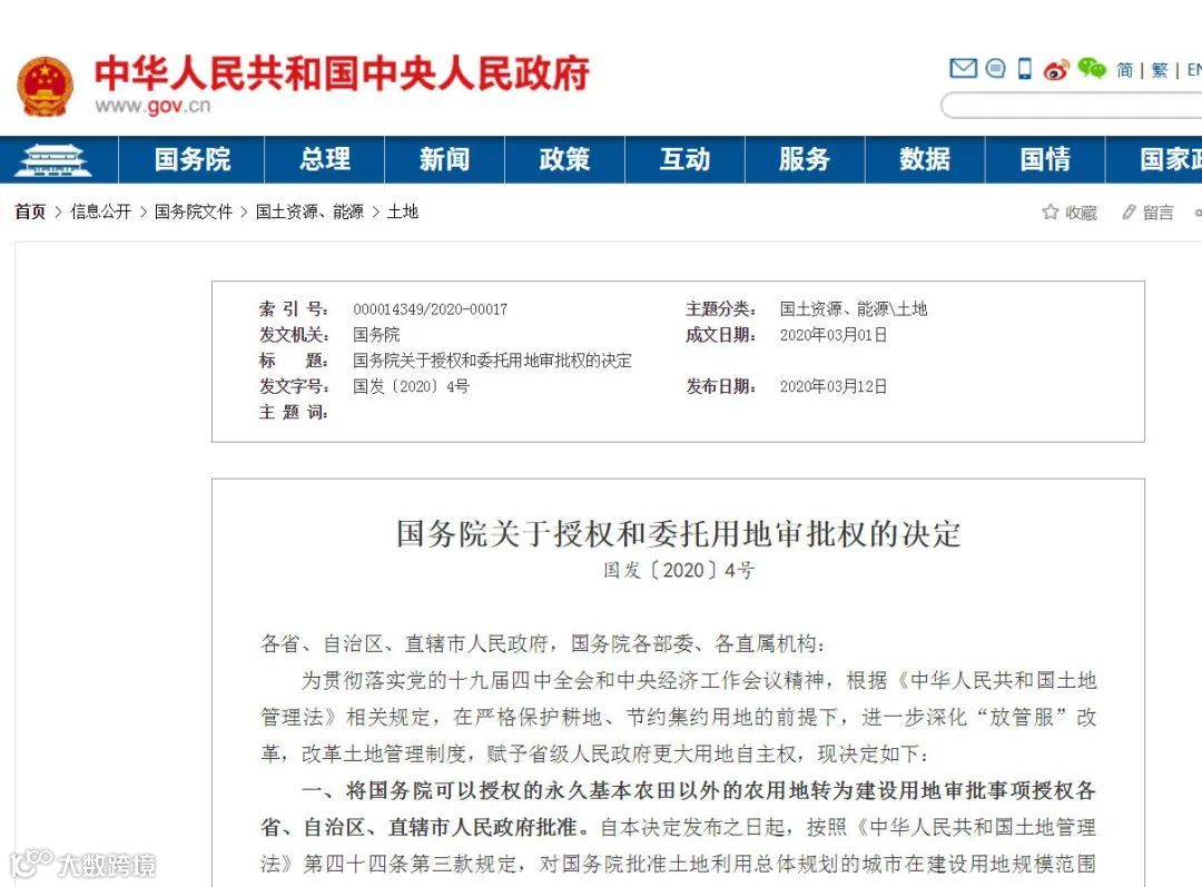 国务院发布《关于授权和委托用地审批权的决定》(以下简称“决定”),提出在保护耕地、节约集约用地的前提下,将国务院可授权的永久基本农田外的农用地转为建设用地审批事项,授权各省、自治区、直辖市人民政府批准。
