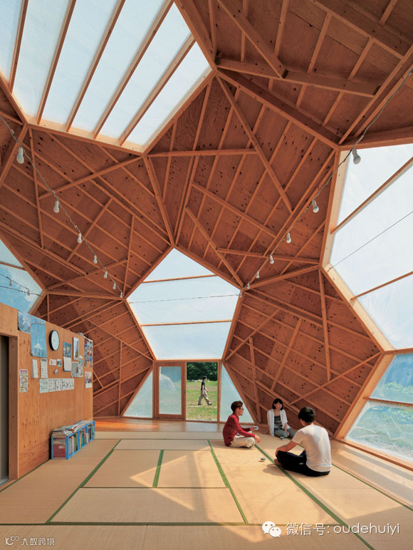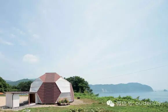 来自京都的建筑师Shinsaku Munemoto与来自立命馆大学建筑学专业的学生以及当地的木匠一起建造了这座位于岩手县宫古市86平米的交流中心。建筑就像一半20面体的足球由若干木板搭建而成,五边形的窗则是以很容易得到的塑料薄膜覆盖。