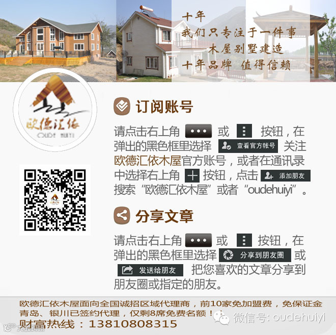 欧德汇依专注木屋行业十余年,是集设计、生产制造、销售、安装、装修、售后服务为一体,专业建造木结构房屋、木屋会所别墅、休闲度假木屋、移动房车、园林景观等多种形式的木制框架住宅和户外木制品,同时经营防腐木材,是专业化、专一型的规模化企业。