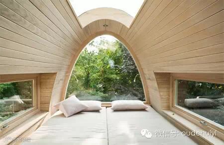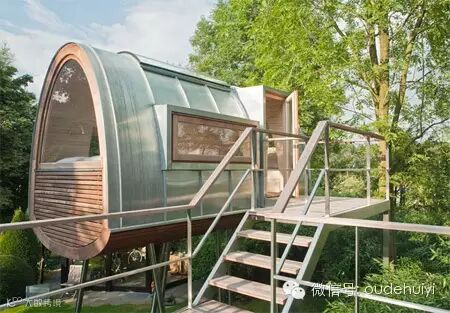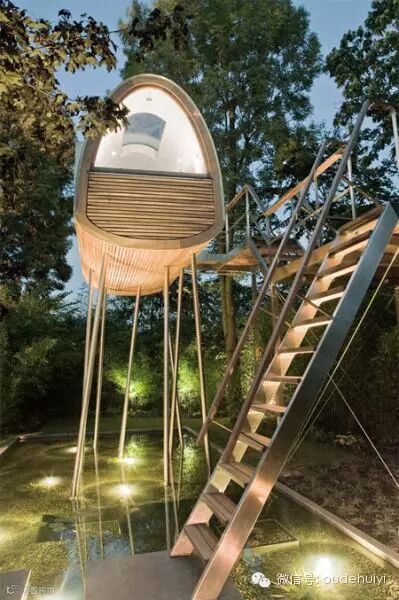 位于德国明斯特一小型私人花园里面的独特小木屋,来自Baumraum设计和建造。椭圆形的木质小屋依靠长长的金属高跷傲立于池塘上,与星球大战中的地形装甲运输步行者(AT-AT)外形颇为相似。里面配备了舒适的大床、现代家具和透明天窗,并有一个惬意的亲景阳台,休闲又舒适。、