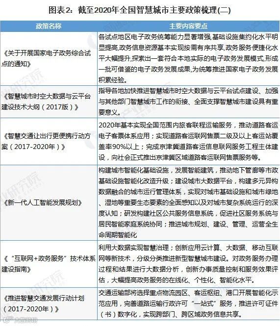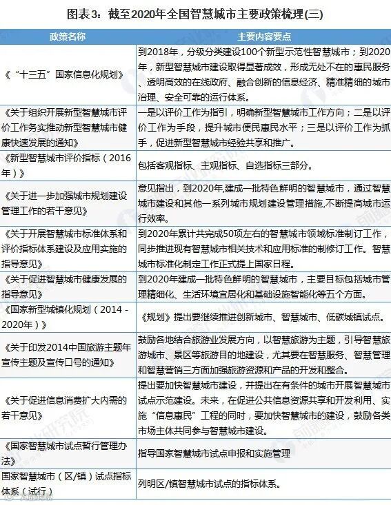 从国家层面来看,进入"十三五"时期以来,我国智慧城市政策密集发布,主要推进电子政务、智慧交通、大数据与云计算的发展,同时完善智慧城市评价指标体系。