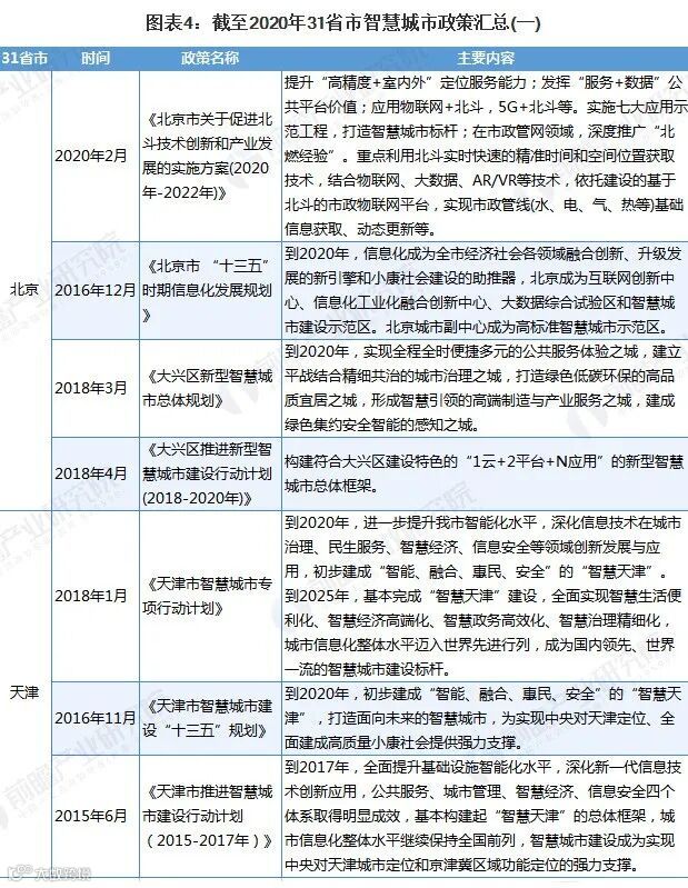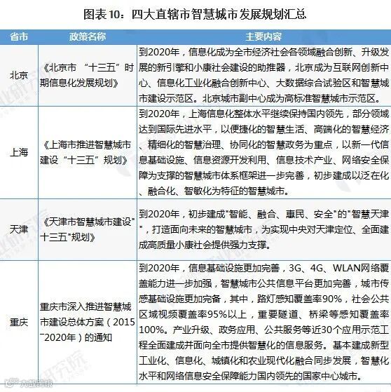 在中央及省级政府的指引之下,各城市依据本地经济和城市建设发展情况,围绕城市发展总体规划,确定智慧城市建设的重点和发展路径,制定出符合当地发展现状的智慧城市建设政策与规划。其中北京、上海、天津、重庆四大直辖市均制定了"十三五"时期智慧城市发展目标,略有不同的是北京市智慧城市目标蕴含在《北京市 "十三五"时期信息化发展规划》当中。