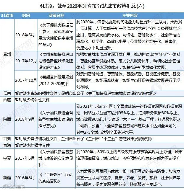 2018年9月,陕西出台《关于加快推进全省新型智慧城市建设的指导意见》,提出到2021年,各市(区)全面建成统一的数据资源网和数据资源池,网络互联互通率达到95%以上,汇聚政务数据80%以上、城市数据90%以上;建成"六个一"基础工程,打通服务群众"最后一公里";全省新型智慧城市建设水平达到全国前列,其中2-3个城市达到全国先进水平。