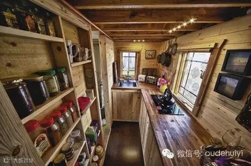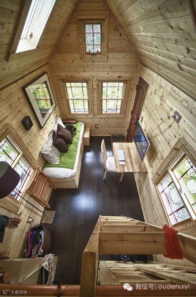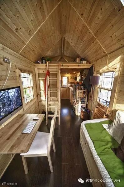有这样一个森林系的小木屋,超小户型,仅仅15.7平。但吃喝拉撒,工作休息都齐备了。不仅整个是木结构,而且还分两层,上层睡觉,下层工作吃饭洗浴,在其中的感觉一定很棒!