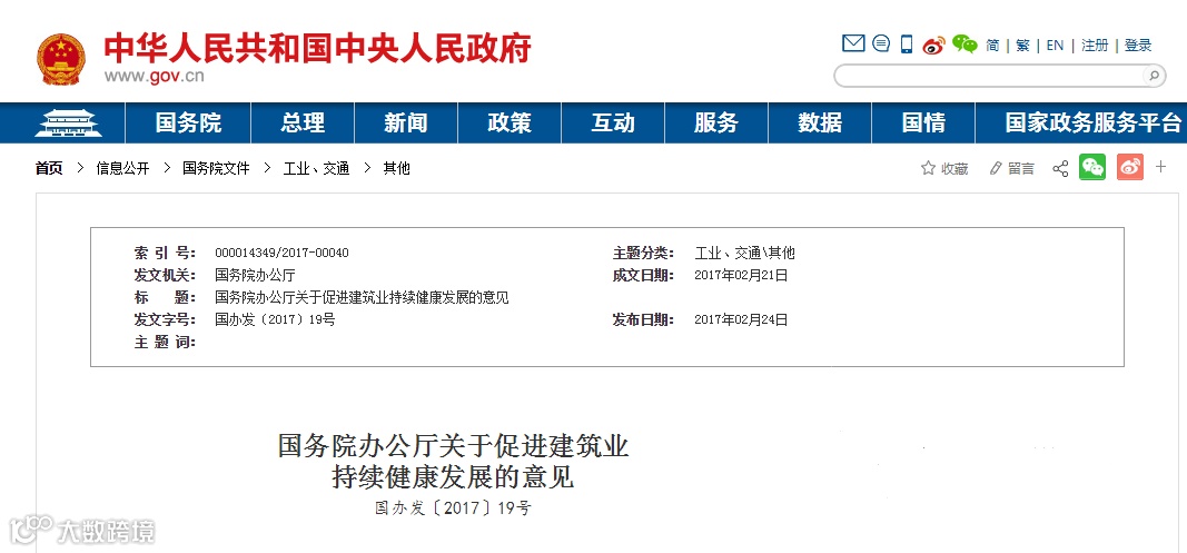 在2017年2月21日国务院办公厅发布的《关于促进建筑业持续健康发展的意见》中,鼓励投资咨询、勘察、设计、监理、招标代理、造价等企业采取联合经营、并购重组等方式发展全过程工程咨询,培育一批具有国际水平的全过程工程咨询企业。