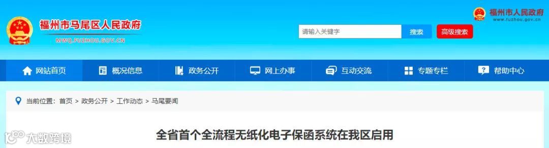 近日,福州市马尾区人民政府发布信息,福建省首个全流程无纸化电子保函系统在马尾区启用。系统实现了线上注册、办结,全流程仅用半小时,甚至不用在开标前到现场,办结即等同于已递交。