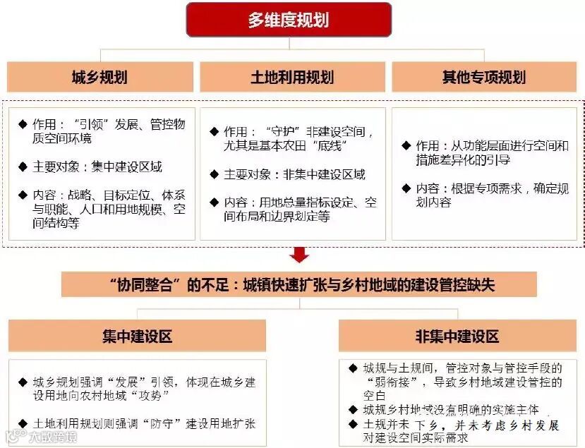 我国“空间”利用相关的规划,长期以来形成了以国土部门的土规、城建部门的城规为核心,环保、旅游、农业等相关部门专项规划相配套的格局。由于服务于不同部门的不同行动逻辑,多维规划在职能、编制思路、编制内容和行动依据等方面有着不同侧重。