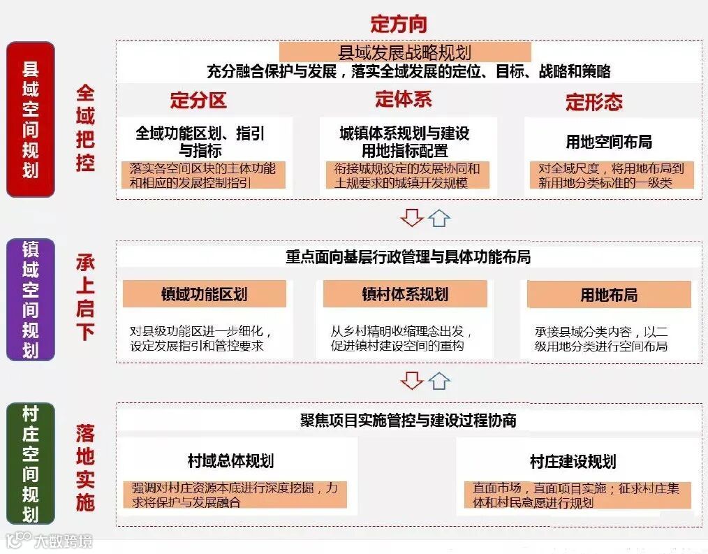 就县域城乡规划而言,已经形成层级鲜明的规划体系,包括:县级的城镇体系规划、总体规划和控制性详细规划,乡镇层级的镇村布局规划和总体规划,以及村庄规划。如果说城规侧重于集中建设区的发展引导、非集中建设地域的保护管控的话,那么不同层级的规划在两个地域的发展与保护中表现出不同的传导性。总体表现为3方面: