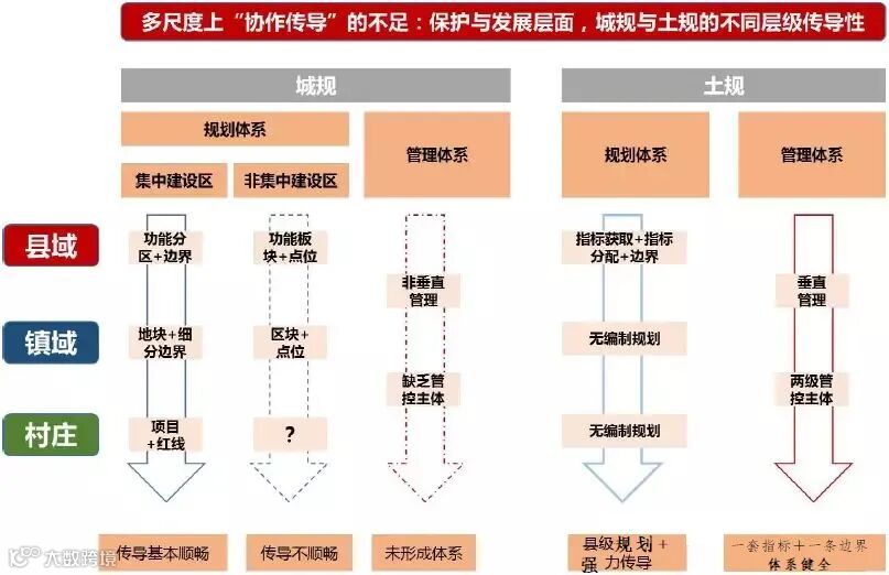 2.2 多尺度上“协作传导”的不足:保护与发展层面,城规与土规的不同层级传导错位