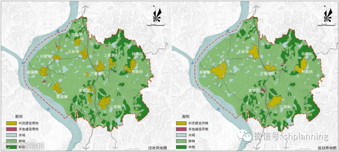 武汉市黄陂区双河村现状用地(左)和规划用地(右)图