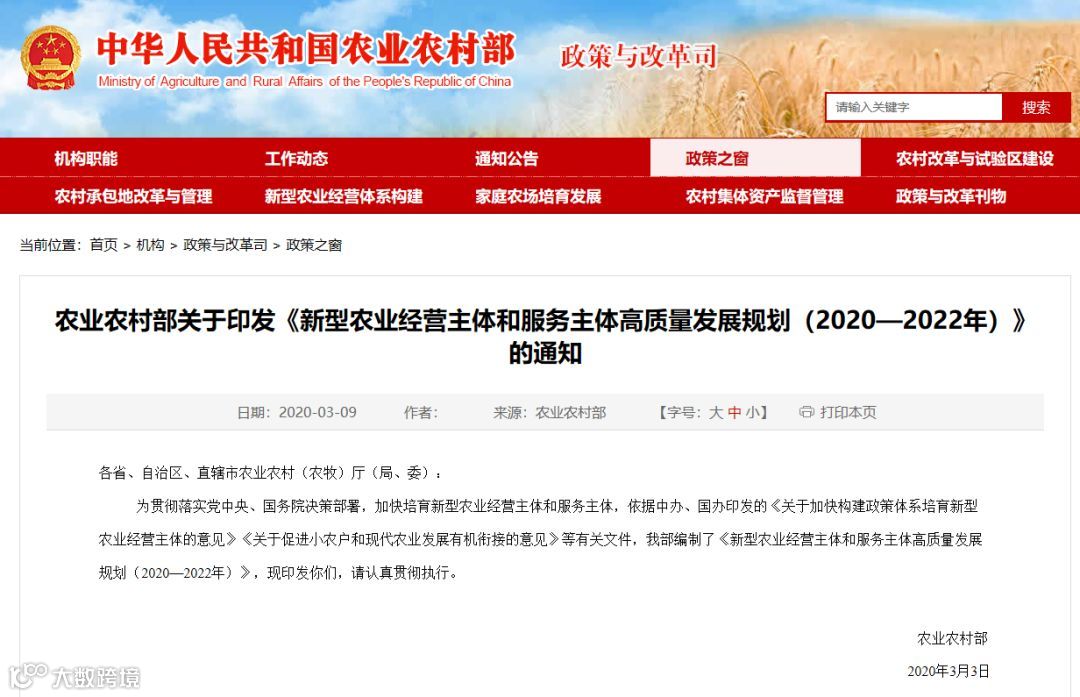 农业农村部关于印发《新型农业经营主体和服务主体高质量发展规划(2020-2022年)》的通知