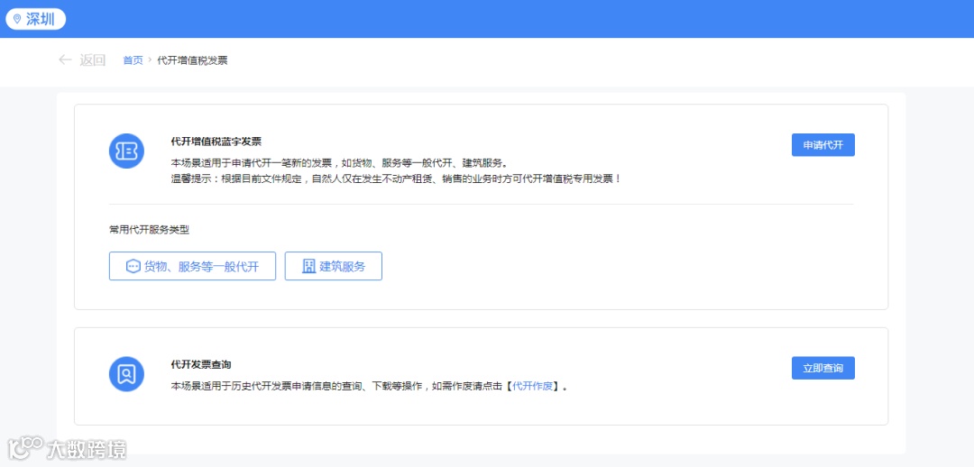 功能路径为【我要办税】-【发票使用】-【代开增值税发票】-【代开增值税蓝字发票】,选择需要代开的发票类型,包括货物、服务等一般代开和建筑服务,点击进入功能。