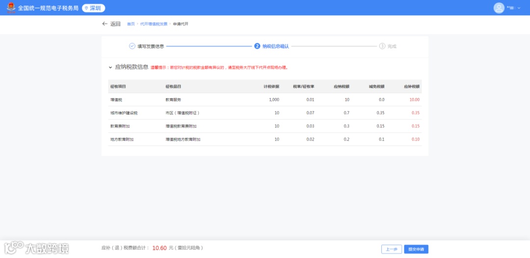系统根据上一步纳税人填写的开票信息,自动计算应缴纳的税款。确认无误后,点击“提交申请”按钮。