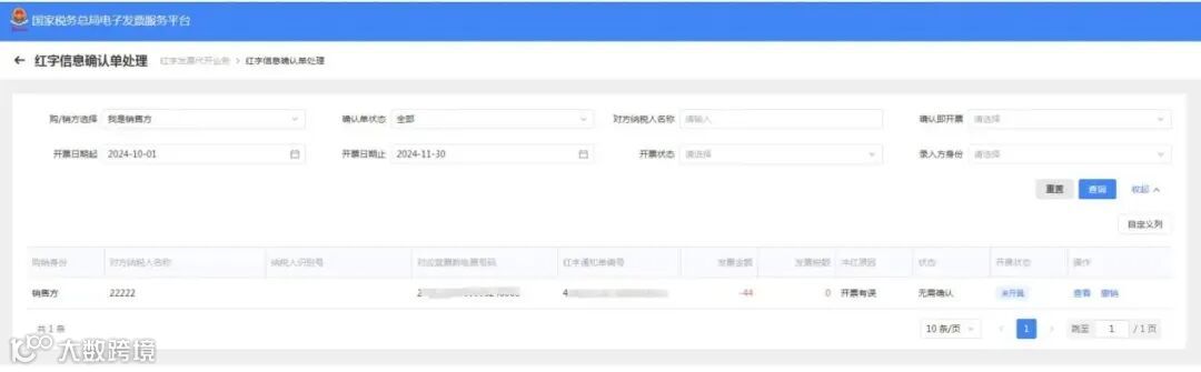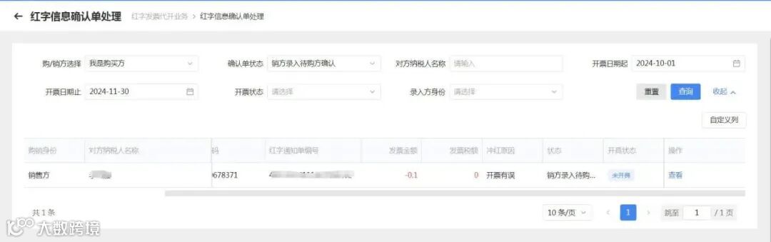 第四步:购买方登录账号,进入【我要办税】-【发票使用】-【发票代开红冲】-【红字信息确认单处理】,筛选条件选择“我是购买方”,查询出对应记录并点击“查看”按钮。