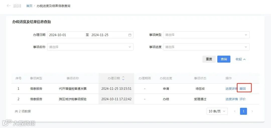 提交代开蓝字发票申请后待审核的发票,如果想要撤回申请,可以通过【我要查询】-【涉税信息查询】-【办税进度及结果信息查询】功能操作。