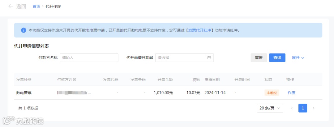 代开蓝字发票申请提交成功后,如果尚未开具数电发票和缴款,可以通过【我要办税】-【发票使用】-【代开发票申请作废】功能作废。