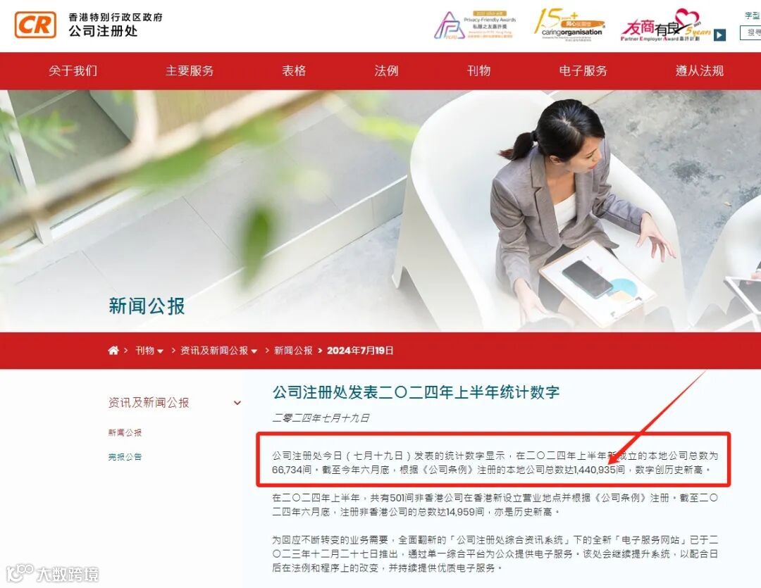 根据香港特别行政区公司注册处最新发布的统计数据,2024年上半年,新成立的香港公司总数为66,734家。截至今年六月底,香港公司总数已跃升至1,440,935家之巨,数据创历史新高。