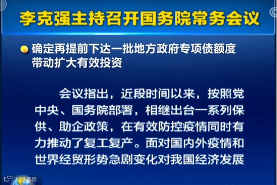 国务院总理李克强3月31日主持召开国务院常务会议,确定再提前下达一批地方政府专项债额度,带动扩大有效投资;部署强化对中小微企业的金融支持;要求加大对困难群体相关补助政策力度。