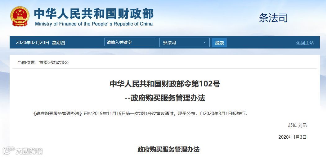 《政府购买服务管理办法》已经2019年11月19日第一次部务会议审议通过,现予公布,自2020年3月1日起施行。
