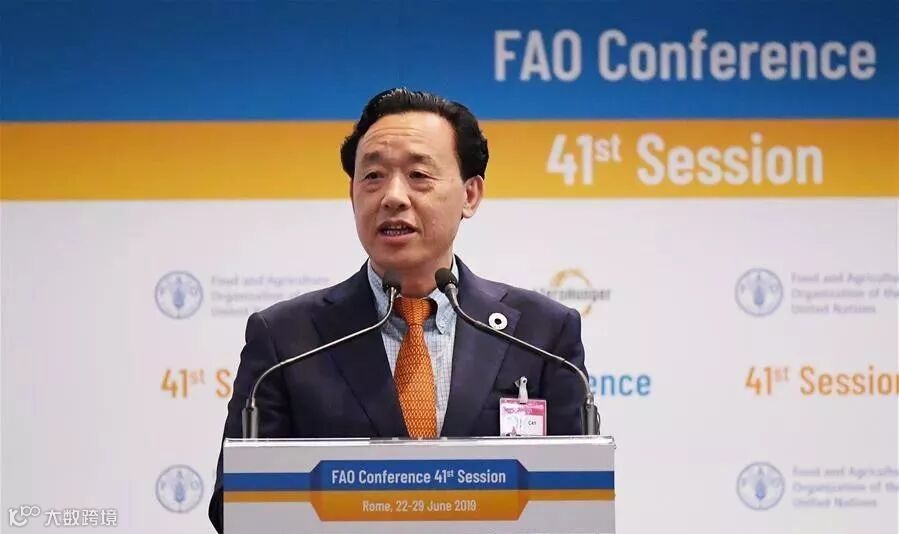 2019年6月23日, 经投票选举,中国候选人屈冬玉(农业农村部副部长)当选为联合国粮食及农业组织(粮农组织)新一任总干事。