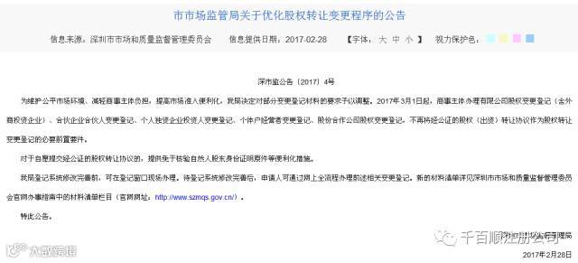 2月28日下午深圳市场监管委官网发布公告称:从3月1日起,不再将经公证的股权(出资)转让协议作为股权转让变更登记的必要前置要件。
