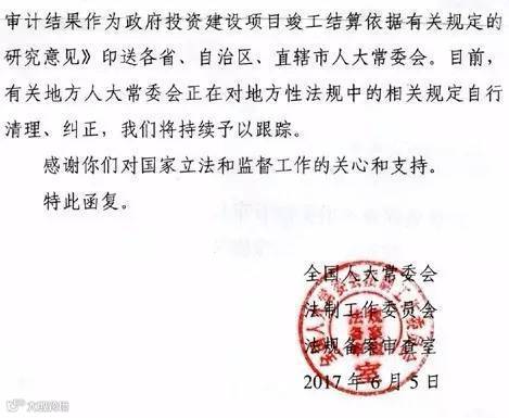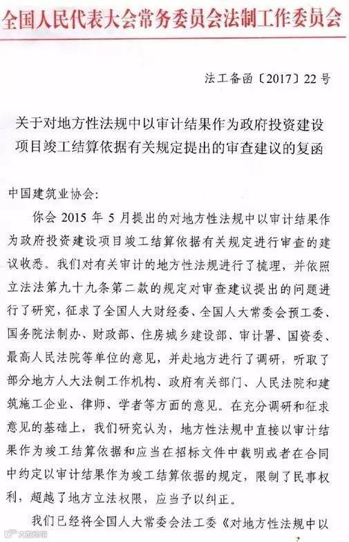 法工委复函《关于对地方性法规中以审计结果作为政府投资建设项目竣工结算依据有关规定提出的审查建议的复函》。该复函提出,经过充分调研和征求意见,认为地方性法规中直接以审计结果作为竣工结算依据和应当在招标文件中载明或者在合同中约定以审计结果作为竣工结算依据的规定,限制了民事权利,超越了地方立法权限,应当予以纠正。