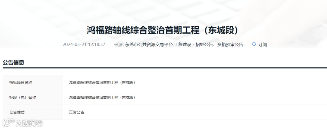 据公告内容,鸿福路轴线综合整治首期工程(东城段),工程东起新源路,西至东莞大道,全长约1.76千米,实施范围为市政道路红线范围及沿线建筑前区空间,道路等级为城市主干道,双向八车道,设计速度60km/h,总投资额约15727.90万元。