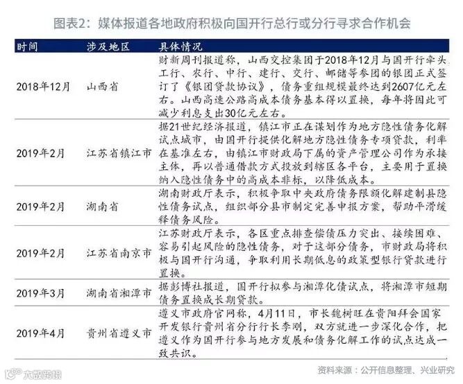 国开行参与地方政府隐性债务置换难以大范围推广。2019年2月,彭博社、21世纪经济报等媒体报道称,江苏省镇江市将作为债务化解试点,由国开行提供化解地方隐性债务专项贷款,主要用于置换纳入隐性债务中的高成本非标以降低成本。随后,江苏省南京市、湖南省湘潭市、贵州省遵义市等地政府先后向国开行总行或当地分行寻求合作。