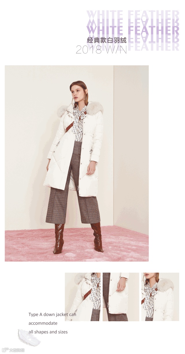 此款A型羽绒服能够包容各种体型的身材,微微收腰的设计凸显腰线,拉长身材比例。搭配阔腿裤和高跟裸靴,完美打造简单的都市造型。