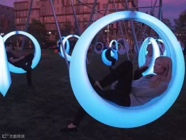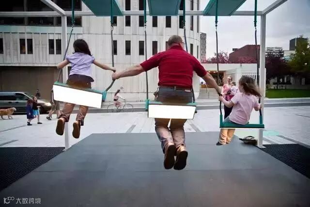 由加拿大设计团队Daily Tous Les Jours创作的Light music swing,这个设计将普通的秋千赋予了新的生命力,在摇摆的同时会有音乐和LED灯光的配合。互动景观并没有增加原本简单设施的操作难度,没有使用繁杂的方式,只是人们在使用它原本的功能时,感受到不同的视听享受。互动景观的关键不只是人与设施的互动,更多的是人与人的互动和交流。