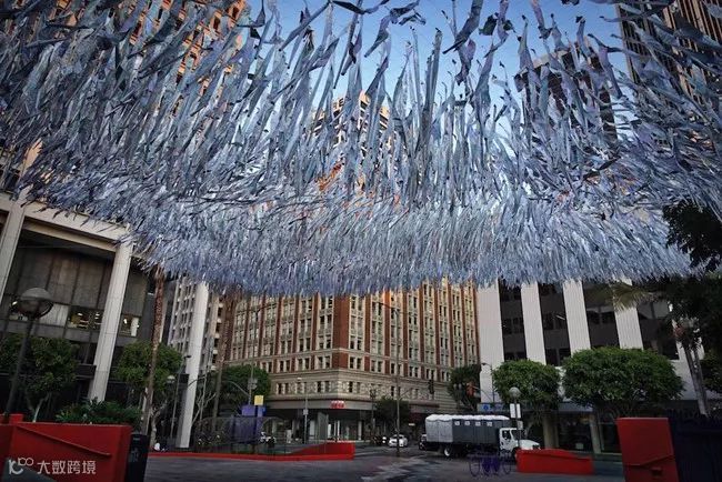 跨越 15000 平方英尺(約 1400 平方公尺),裝置艺术「Liquid Shard 液碎」在洛杉矶市中心的 Pershing Square 上随风摇曳。这件疑似银河落九天的閃亮作品,由 Poetic Kinetics 的 Patrick Shearn 所創作,使用聚酯薄膜及單纖維,打造亮晃晃的反光效果。在洛杉矶市中心的Pershing Square上空,漂浮着银色的海洋,这是由众多银色的碎片组合的装置艺术,随风摇曳,吸引不少观众与这悬浮在空中的海合影。这个空气流体雕塑装置面积达15000平方英尺,贯穿广场和远处的高楼大厦。这个作品的目的不仅是美化广场,这是科技之美和自然之美的结合,也意在为在此地停留的人们带来了一片阴凉。