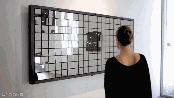 把两百个完全相同的小反射镜排成网格铺成平面静态的整体挂在墙上。人们走进装置,各个小镜子会感应到人脸的位置而转向面对人脸,跟踪捕捉人们的脸部位置并随着他的移动而移动。