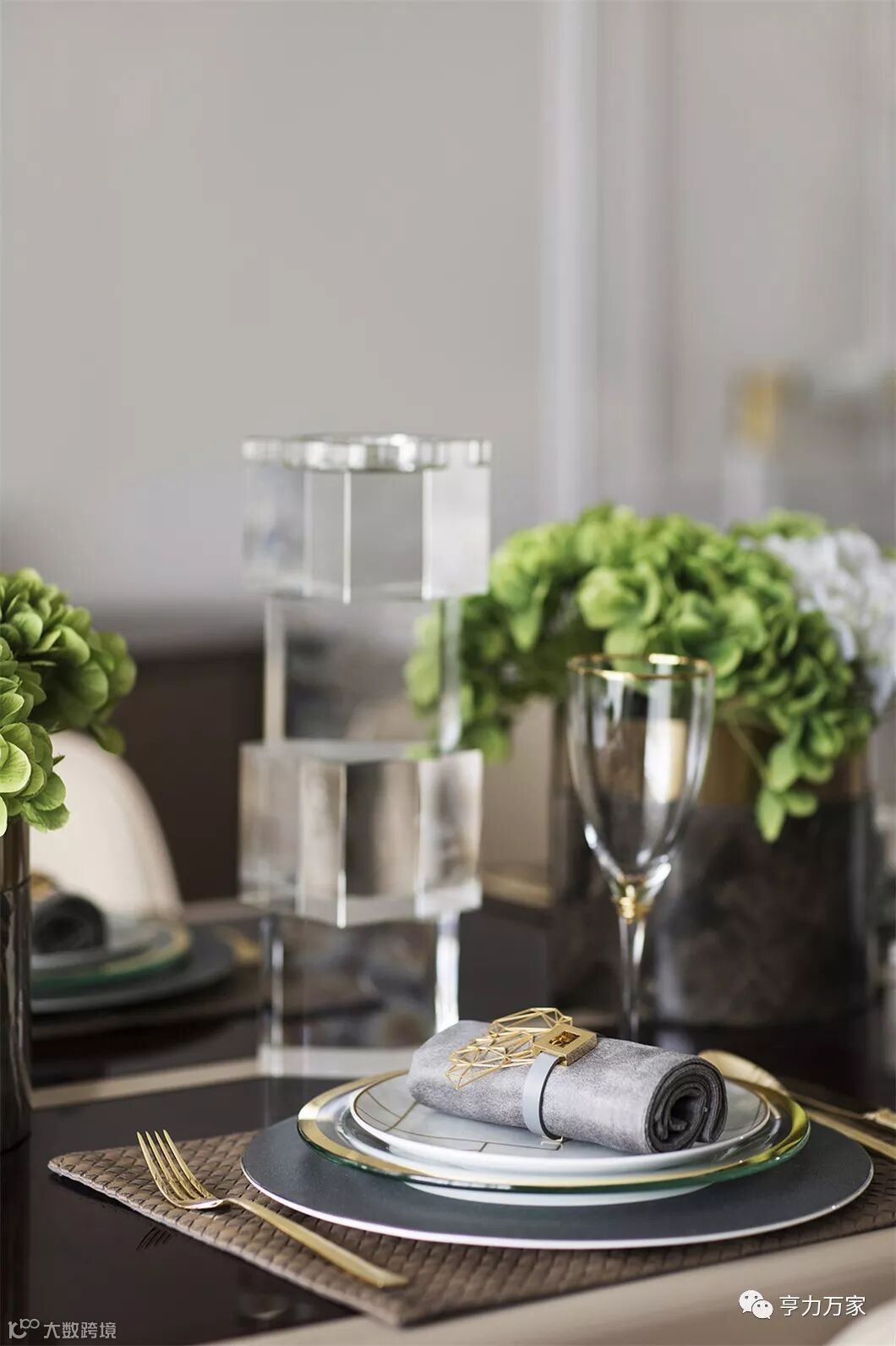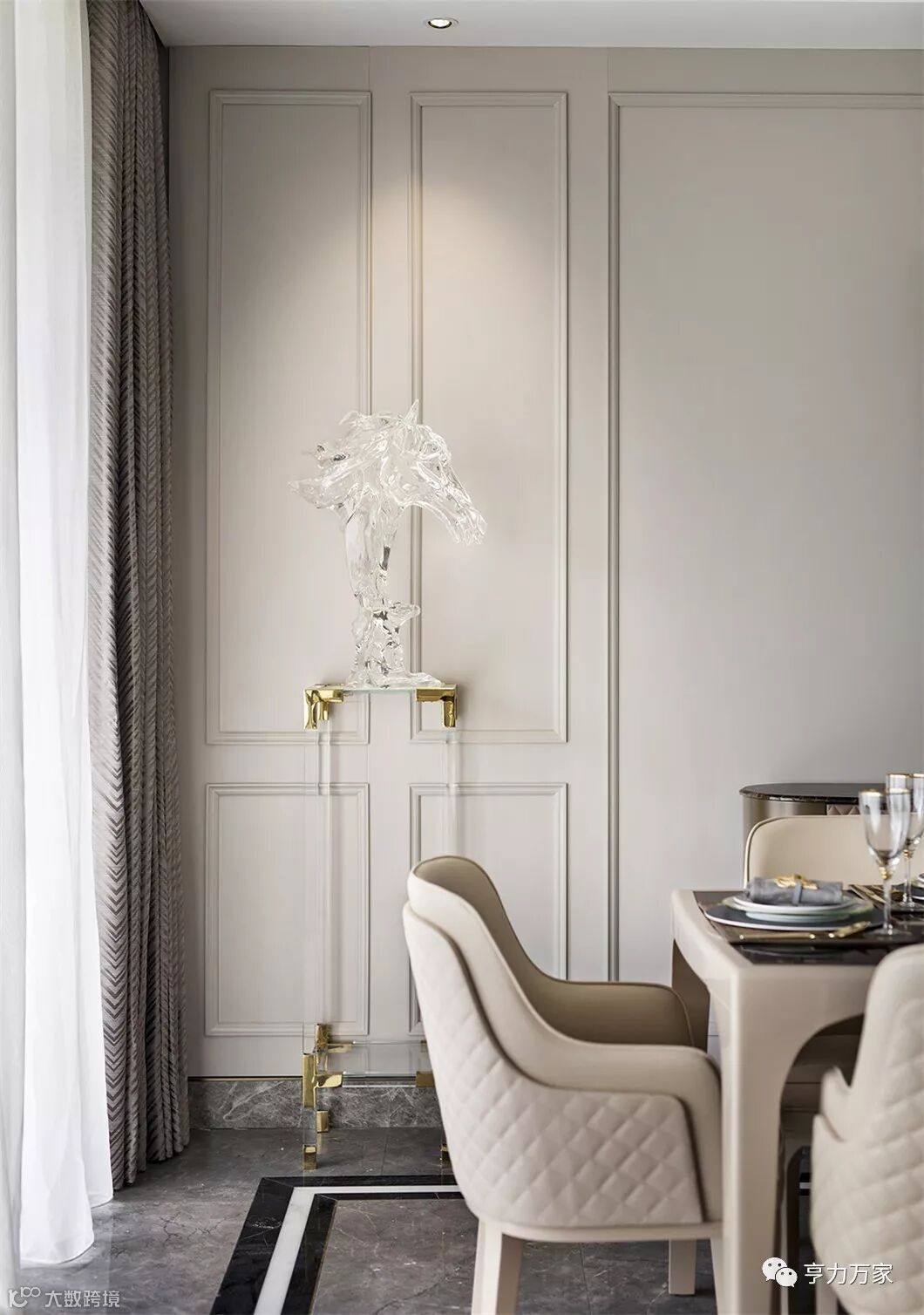 ▲用餐区设计清雅现代,米白色的背景墙以简化的护墙板包裹,左右对称的极简线框,正置中央的黑边镜框,一组水晶造型飞马侍伴左右,共同营造出用餐的仪式美感,现代风的悠然轻灵和欧式的优雅美学于此共同发声。
