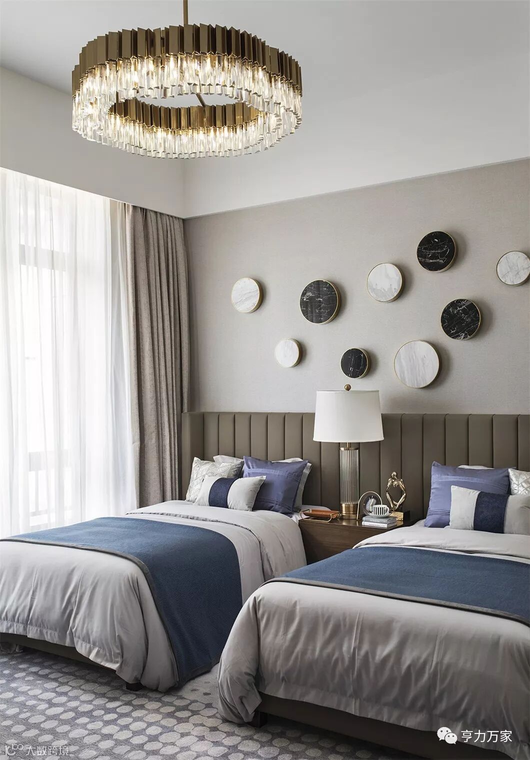 ▲老人房为酒店式的双人床,关照老人更优质的睡眠,整体环境清爽且稳重,圆形黑白大理石艺术装饰画与灰色地毯上的白色圆点花纹互相呼应,中性偏柔和的空间中,一抹深幽的蓝色具有平衡的作用,安静又宁谧。