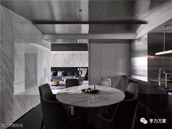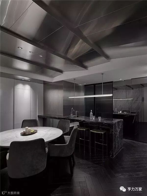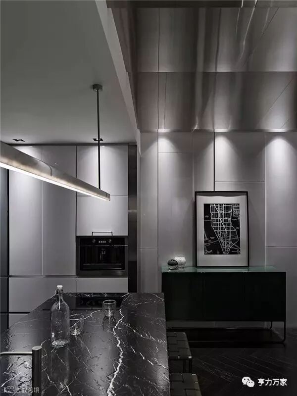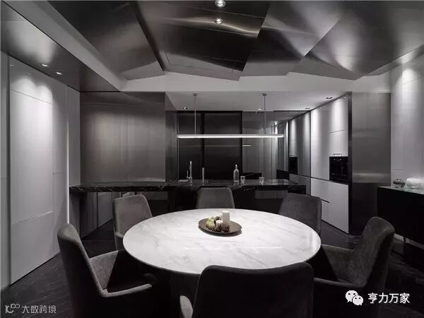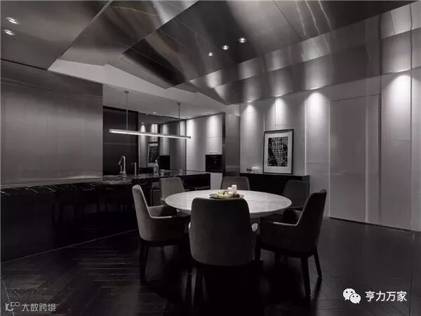走进厨房,虽然运用了个性强烈的不锈钢来刻划出空间个性,但在天花板的部分,我们用层次的堆迭营造空间立体感,同时在柜体与墙面上运用钢琴烤漆烘托出空间的细致。