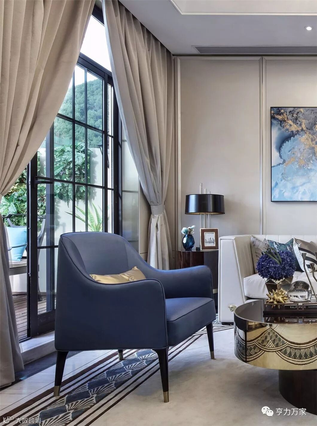 设计平和淡雅,弥漫着静谧安宁的氛围。低调柔和的浅蓝色调,知性温馨、大气简约且不乏时尚的软装元素,诠释着主人对美的品味追求与超凡脱俗的气质。细节处融入一些老旧物件的形制,使设计在复古中建立起一种明朗干净的现代审美。