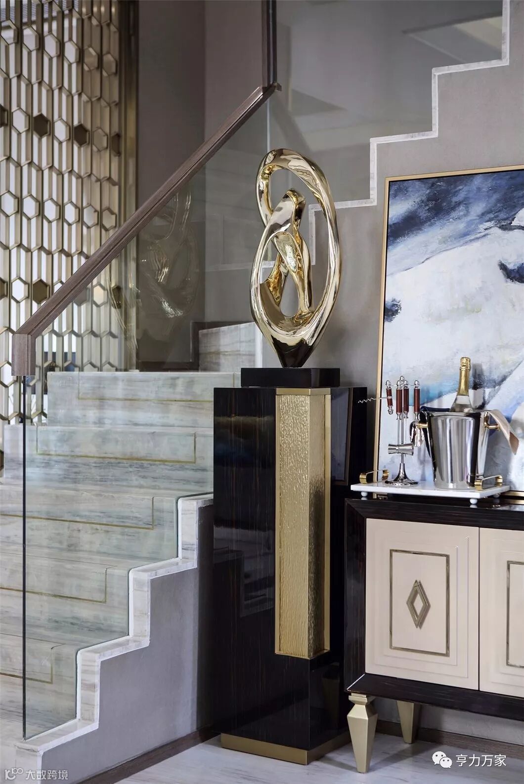 时尚现代的主调中,设计师巧妙纳入中国传统配色中的黛蓝,将中国传统屏风隔景和漏景的效果以现代的材料表现出来。在中西结合的同时触类而长,创造出崭新的空间美感,赋予现代设计更可供琢磨的精致优雅感,另有一番都市风情。