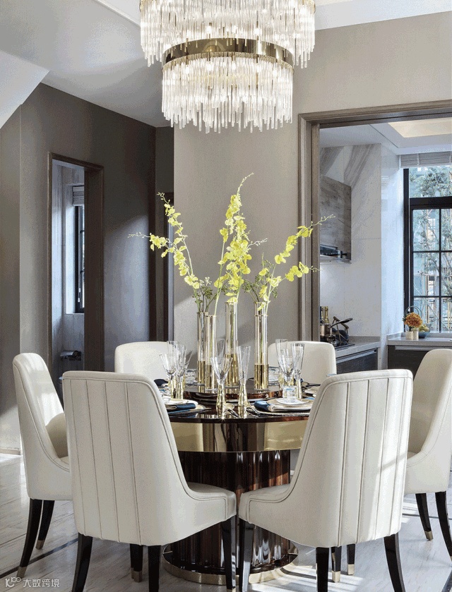 客厅整体空间为浅色系,线条简洁硬朗,象牙白的背景色,奠定了空间低调的质感、优雅的基调。设计师采用大量高级皮质材料,巧妙搭配自然质感的石材以及金属元素,璀璨的金色和几何经典,给予色彩最大的礼赞。流光溢彩的水晶吊灯尽显奢华,恰如一个浪漫的音符,赋予空间生动轻灵的魅力。