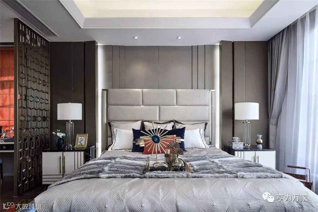 主卧组合了丝绒面料、马毛地毯、精致水晶、尊贵皮质等现代元素,呈现出品质生活的现代追求。设计灵感来自被誉为不夜城的“New York City ”,并巧妙介入都会元素,塑造出让人迷恋的简洁、奢华与雅致,让我们仿若置身纽约曼哈顿,沉浸在时尚优雅的都市氛围中,享受现代人心之向往的自由与洒脱。