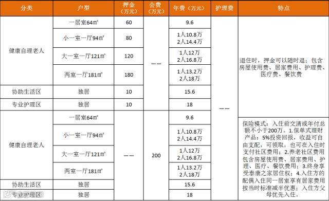 保单模式: 买200万保单获入住资格(年限最长10年,一年20万,分红可补贴月租费)+9600元/月起步的月租费;