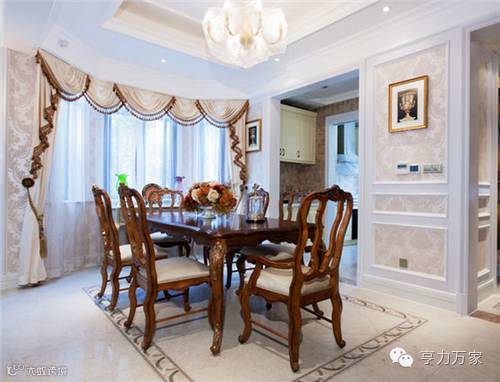 在延续客厅色彩、材质的基础上,餐厅设计力求创造出浪漫、温馨、自然的氛围。与壁纸色系相同的窗帘,边角的线条与实木餐桌椅的色彩呼应,使实木餐桌椅在餐厅中显得不突兀。