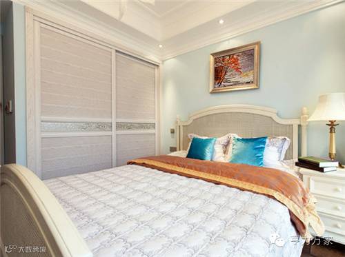 卧室的墙面涂刷成粉蓝色,搭配白色系的家具、床品与整体色彩匹配,使空间看起来更加纯净。