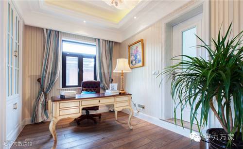 书房墙面铺贴了竖条纹壁纸,拉伸了空间高度。白色书桌采用金色线条勾勒,层次分明,十分优雅。而蓝白条纹的窗帘让书房看起来更加的清爽。
