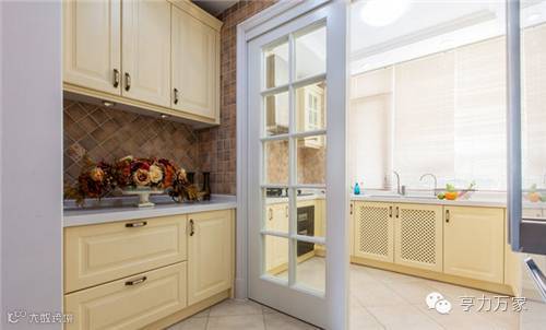 厨房设计打破了客餐空间的色彩,这间开放式的厨房通过一扇透明白色门分隔出中西式两个厨房,香槟色的橱柜设计,给人浪漫、时尚之感。
