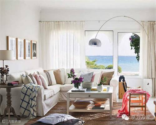 从客厅的窗户向外望,美丽海景尽收眼底。客厅装饰十分朴实清新,白色的窗帘质地轻薄,白色的布艺沙发简单朴素,几款不同颜色的抱枕带来了不同的色彩元素,咖啡色的地毯舒适而温馨,落地灯的弧形设计很是优雅。