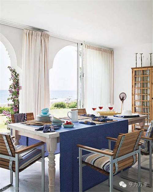 餐厅区域显露出浓浓的地中海风情,弧形的落地窗顶,相得益彰的蓝色桌布与白色窗帘,朴实原木的家具材质,无一不是最经典的地中海元素。