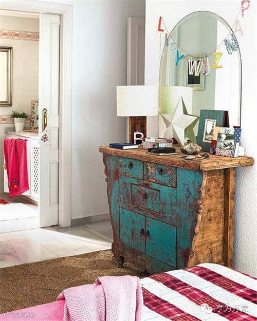 梳妆台是一个非常古朴的原木家具,未经细致加工的木材甚至能够看清原本的纹理,旧旧的涂漆不知是经久剥落还是有意为之。