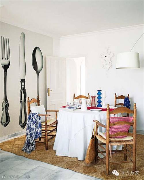 另一个小型用餐区秉持了同样的设计理念,地毯与客厅所使用的为相同款式,背景墙上的餐具图案极具创意和特色。白色为主色调,蓝色与红色的软装与器具注入了色彩的活力。