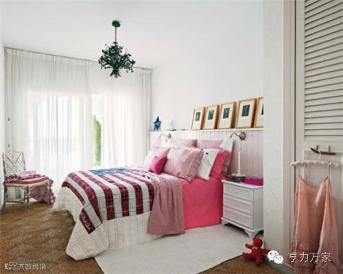 红+白的卧室色彩搭配,红色系的深浅色块在空间中划分出了层次感,卧室的吊灯也是一个亮点,奇特的造型带来一丝灵动气息。