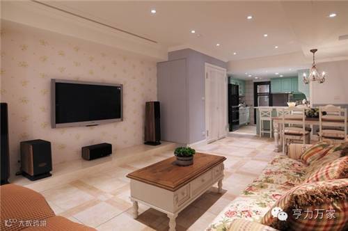 沙发对面的电视背景墙则是以白色为底加黄色花样的精美壁纸为铺贴,很是别致。旁边的墙面上则是以紫色乳胶漆刷至而成,雅致而舒心。